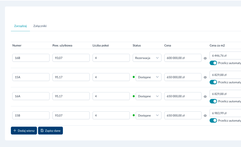 Dodawaj dowolną ilość lokali mieszkalnych. Zarządzaj statusami dostępności, cenami w intuicyjny sposób. Skorzystaj z automatycznego przeliczania ceny za m2.