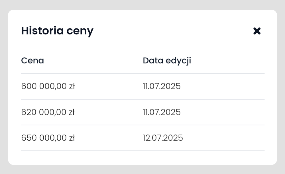 Historia zmian cen: System automatycznie zapisuje i prezentuje pełną historię zmian cen dla każdego lokalu, zgodnie z wymogiem ustawy. Każda zmiana jest opatrzona datą jej wprowadzenia.