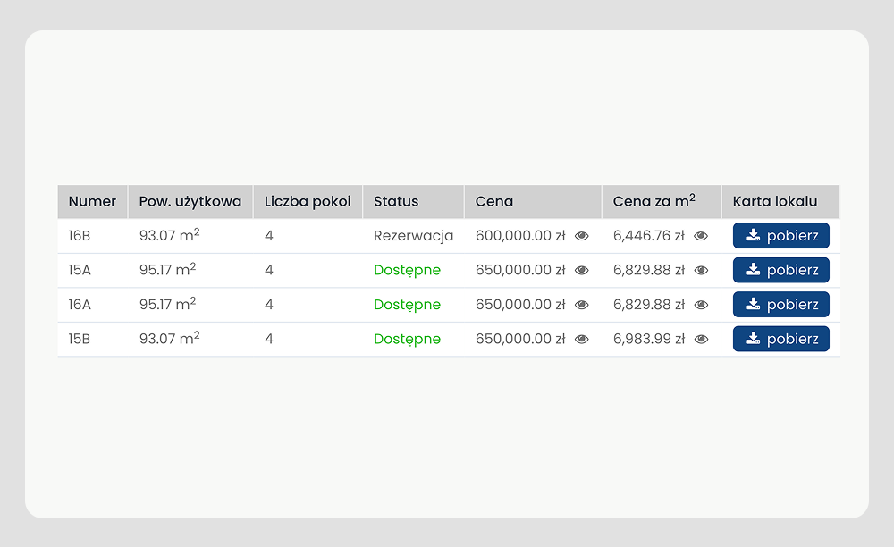 Prezentacja cen: Wyświetlisz na swojej stronie internetowej cenę za m² oraz cenę całkowitą każdego lokalu, a także ceny pomieszczeń przynależnych (np. komórek lokatorskich, miejsc postojowych).